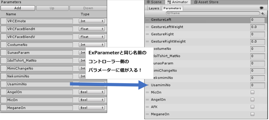 **名前が一致しているパラメーターの数値がコントローラー側のパラメーターにセット**されますにゃ!